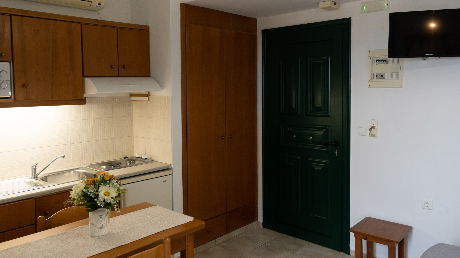 Studio is located in the first floor and has endless view to the sea of crete and the small island of Dia. From the balcony you can enjoy the magnificent sunset, the fishing boats sailing and the valey of Analipsi, which is full of olive trees.
